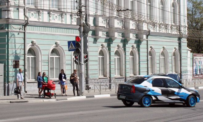 Почему не где-то там? Троллейбус такой на каких сама не раз ездила. Здание тоже очень знакомое (хоть не была в Рязани), в наших городах много похожих зданий. А где-нибудь в Европе, мне кажется здания все ж другие. Серый столб с остатками объявлений… Дорожные знаки такие как у нас, серенький железный заборчик, полустертая разметка… общая пошарпанность