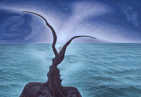 "Поцелуй моря" — картина Октавио Окампо (мекс. художник-сюрреалист). В этой картине, как и во-многих других, выполненных в метафорическом силе, все отдельное друг от друга, разное и единственное, переплетается в единый целостный образ — море, облака, люди — все сливается в единый живой поток. Я насчитал здесь восемь лиц.
