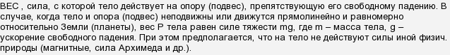 Если исходить из определения, данного в упомянутой энциклопедии, то, вероятно, надо признать, что этот источник НЕ БОЛЕЕ «… авторитетный, чем Википедия или любой из тут тусующихся». Ну хотя бы потому, что, например, в школе решают задачу, типа: «Сколько будет весить на дне бассейна стальной шар с известным радиусом?» А Архимедову силу атмосферы тоже порой приходится учитывать при определении веса. Из всего этого следует, что и определение приведенное в энциклопедии, так же опирается на силу тяжести (да еще если вспомнить упоминание свободного падения), наличие которой для возникновения веса не обязательно. Так что, извините, уважаемый Роджер, но я не соглашусь с Вами, что «…тут всё объяснено исчерпывающим образом».