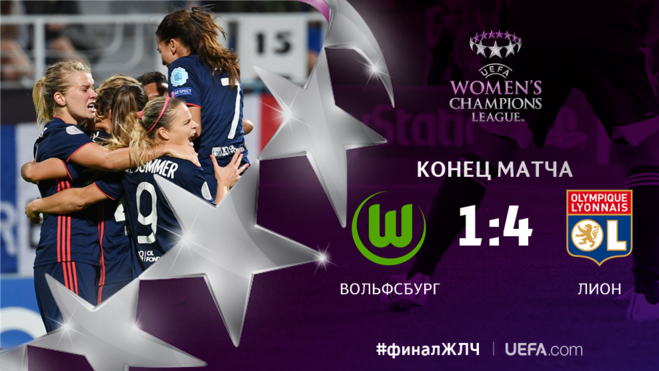 В Киеве прошел финальный матч женской Лиги чемпионов этого сезона, где за трофей боролись немецкий "Вольфсбург" и французский "Лион". Основное время матча завершилось без забитых мячей, а в дополнительное время началось настоящее безумие. Счет открыли немки, на 93-й минуте отличилась Хардер, на что последовал мощнейший ответ, в течении пяти минут француженки трижды огорчили кипера "Вольфсбурга", а во втором дополнительном тайм поставили точку в игре.