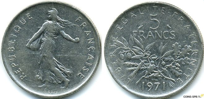 Есть монеты магнитящиеся, а есть немагнитящиеся. Первые притягиваются магнитом, вторые — нет. Притянет ли обычный магнит монету Франции 1971 года номиналом в 5 франков?