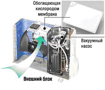 Но существуют такие модели сплит-систем, которые удаляют воздух из помещения, и даже подают в помещение очищенный из наружного воздуха кислород. Судя по описаю в каталоге, эта модель забирала воздух снаружи, через специальную кассету молекулы более крупные, чем молекулы кислорода задерживались, а молекулы кислорода подавались в помещение, обогащая воздух помещения кислородом.