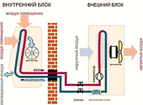 Внутри наружного блока стоит моторчик с турбиной, который гонит уличный воздух по трубке в наружный блок.Трубка подачи воздуха уложена вместе с сливной для конденсата, кабелем и медной трассой в одну связку, поэтому ее не видно.