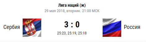 Женская сборная России в рамках Лиги наций перебазировалась в Сербию и в первом туре сыграла с хозяйками этапа и здесь сопротивление было оказано только в первом сете, сербки оказались на голову выше в мастерстве и заслужено победили в трех сетах — 3:0.