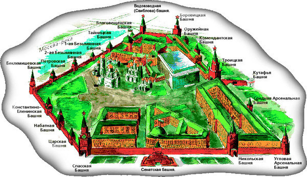 Самая известная из них — это Спасская башня (внизу слева), далее Никольская башня (внизу справа). Бороицкая и Троицкая башни, которые на рисунке представлены в правом верхнем углу. Последней башней, которую украсили пятиконечной звездой, стала Водовзводная башня (на рисунке в самом центре вверху).