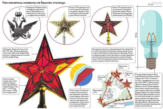 Ранее звезды венчали только четыре башни Кремля (за исключением Водовзводной), а до революции вместо звезд на башнях вообще красовались двуглавые орлы. На схеме расписана история смены символов на башнях Московского Кремля: