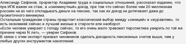 Другой вопрос в том, что большинство россиян, подавляющая их часть, вряд ли сможет найти деньги, чтобы смочь отложить их "на старость ". Я живу в таком окружении- люди живут от зарплаты-до зарплаты.
