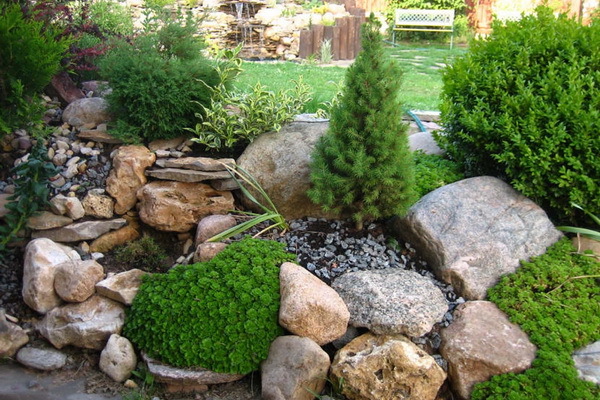 Для альпийской горки подойдут растения, которые в природе произрастают в гористой местности, на склонах, песчаниках. Пышноцветущие высокие кустарники не стоит использовать, они не будут гармонично смотреться среди камней. При подборе растений нужно учесть многие факторы: освещённость, длительность цветения, сезонность, окраску, высоту растений. Растения следует распределять по требовательности их к свету. Обычно композиции для альпийской горки составляют из хвойных карликовых пород (сосна горная, можжевельники стелющиеся, горизонтальные, чешуйчатые, туи западные, ели невысокие), из лиственных используют самшиты, низкие сорта кизильника, барбарисов. Дополняют ассортимент засухоустойчивые многолетники и однолетники, травы, почвопокровние растения. Молодило, очиток, тимьян ползучий, лаванда узколистная, флокс шиловидный, чистец византийский, папоротники, гейхеры, примулы, бадан, хосты, ясколка, горечанка и многие другие.