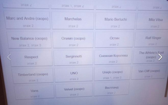 Albione Bath Body Works Calzedonia -скоро откроют, Climber, Elegfnza, Etam. FINN FLARE, GERRY Weber-скоро откроют , Guess, Incanto c, KOTON, Kanzler c, Loccitane, LCWAIKIKI, LUSH, MAC(скоро), Эконика (скоро ) , ГЕОКС- не открыт .