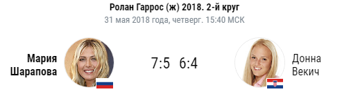 31 мая 2018 года на Открытом чемпионате Франции по теннису в матче второго круга россиянка Мария Шарапова встречалась с представительницей Хорватии Донной Векич.
