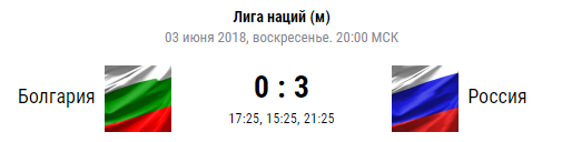 Мужская сборная Болгарии довольно не простой соперник, но сборная России очень серьезно собралась на этот поединок и все три сета провела на отлично, в итоге победа — 3:0, самым результативным проявил себя Егор Клюка с 16-ми очками.
