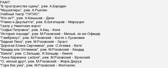 Также, служил на сцене Российского академического Молодежного театра. Его работы: