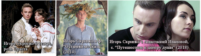Игорь Сергеевич Скрипко (30 мая 1991 г., род. в г. Сызрань, высокого роста, лучше владеет левой рукой) — актер российского кино и театра. Его можно увидеть в разных сериалах и фильмах, всего — 25 работ.
