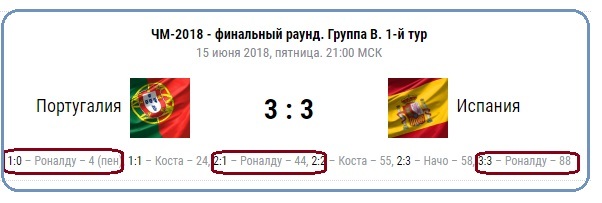 Футбольный матч между сборными Испании и Португалии проходил 15 июня 2018. Счет 3:3. Первый гол забил Криштиану Роналду на 4 минута 1 тайма. Через 20 минут (24 минута) Испания выравнивает счет. Забивает Диего Коста. Роналду снова забивает на 44 минуте. Коста не отстает и на 55 минуте забивает ответный мяч. Практически сразу же (на 58 минуте) еще одно очко к испанскому результату добавляет Начо — счет 2:3. За несколько минут до финального свистка Роналду фантастическим образом реализует пенальти. Закрученный мяч перелетел через "защитную" стенку и отправляется в верхний правый угол ворот испанцев. таким образом, матч был сыгран в ничью — 3:3.