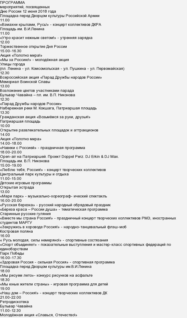 В Йошкар-Оле пройдет ряд мероприятий, посвященных Дню России. К примеру, можно пойти на площадь имени Ленина в 11 часов на утреннюю зарядку "Утро красит нежным светом!" Затем там же в 12 часов пройдет торжественное открытие праздника, а в 15 часов начнется акция "Полотно мира" и "Мы-за Россию!" Вот полный перечень всех мероприятий (источник):