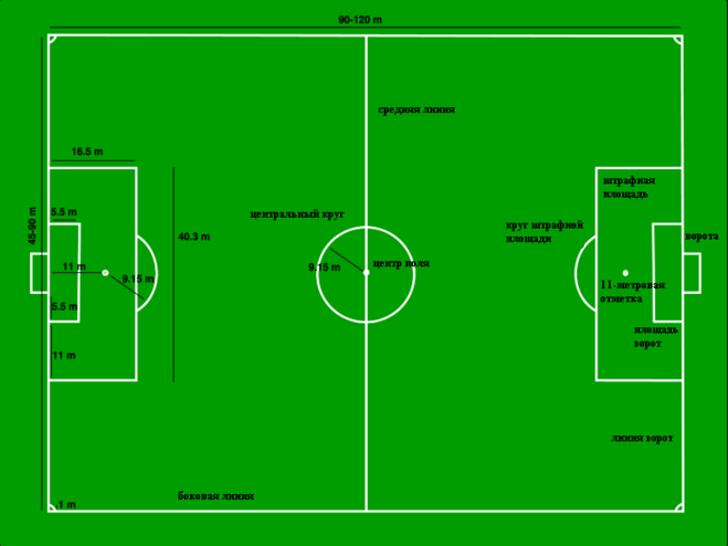 Если внимательно присмотреться, то можно заметить, что круг в центре поля и обе дуги в штрафных площадках одинакового радиуса, который составляет 9,15 метров. Почему именно 9,15 метров? Потому что это ровно 10 ярдов. Именно в этом радиусе, согласно правилам, не должно быть игроков в момент пробития штрафного удара, или пенальти.