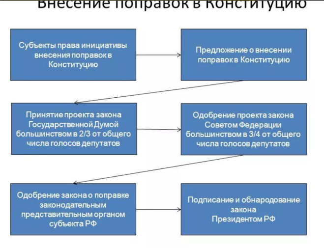 Чтобы обсуждать новый закон, то сначала нужно чётко и ясно сказать, что новый закон это прямое нарушение Конституции РФ. Повышение пенсионного возраста может быть оправдано только увеличением рабочих мест и нехваткой их. Введение этого неувязанного закона сделает часть граждан не гражданами – без работы и без пенсии человека просто нет. Это похоже на возврат крепостного права, т.е. рабства. А это прямо связано со здоровьем и безопасностью нации. Значит конституция уже нарушена даже по этой статье. Социальное обеспечение — одно из основных направлений развития любого демократического, правового государства. Конституция РФ принята всенародным голосованием 12.12.1993 года и действует в настоящее время с внесенными поправками. Для принятия поправки по повышению пенсионного возраста потребуются следующие действия: