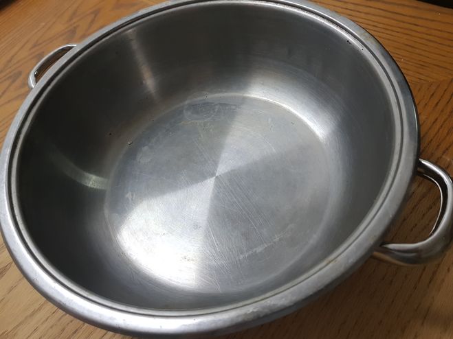 Сейчас, правда, такой и купить сложно, и говорят, что это вредно из-за окисления. Потому можно использовать широкие тазы или сотейники из нержавейки с толстыми стенами и, главное, дном. У меня на этот случай есть такая посудина: