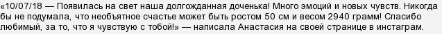 Рост малышки — 50 см, вес — 2940 грамм. Очень рада за их семью, мама выглядит хорошо и чувствует себя тоже вполне себе отлично, судя по социальной сети. Врач Анастасии во время родов — Анна Валерьевна Аграновская.