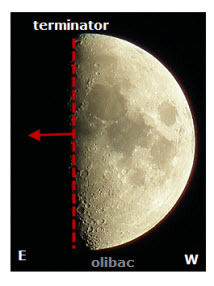 Например, терминатор Луны в первой четверти проходит ровно посредине видимого диска Луны и делит его на две части — освещенную и неосвещенную.