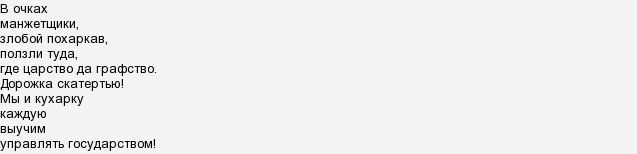 Причем в первоисточнике эти слова звучат несколько иначе, да и смысл в ней заложен несколько иной: "Мы не утописты. Мы знаем, что любой чернорабочий и любая кухарка не способны сейчас же вступить в управление государством. В этом мы согласны и с кадетами, и с Брешковской, и с Церетели. Но мы отличаемся от этих граждан тем, что требуем немедленного разрыва с тем предрассудком, будто управлять государством, нести будничную, ежедневную работу управления в состоянии только богатые или из богатых семей взятые чиновники. Мы требуем, чтобы обучение делу государственного управления велось сознательными рабочими и солдатами и чтобы начато было оно немедленно, т. е. к обучению этому немедленно начали привлекать всех трудящихся, всю бедноту"