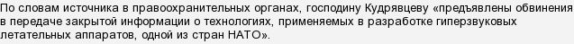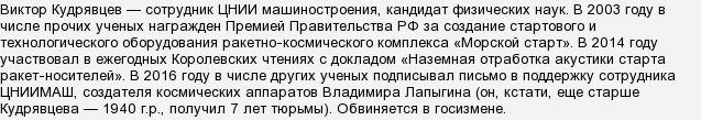 Виктор Викторович Кудрявцев, ученый из Королева, в данный момент находится в Лефортово. Он обвиняется по статье 275 УК РФ "Государственная измена". Арестован на два месяца. Сам задержанный свою вину не признает. Этому делу присвоен гриф "Совершенно секретно", поэтому известно о нем минимум. Так, в пятницу 20 июля 2018 года ФСБ пришли с обыском в Центральный научно-исследователь­ский институт машиностроения (ЦНИИмаш), являющегося головным в "Роскосмосе". Спустя два дня в прессе появилось сообщение об аресте Виктора Кудрявцева. Пишут, что всего по этому делу проходят порядка 12 человек. Немного подробнее об этом можно прочитать тут.