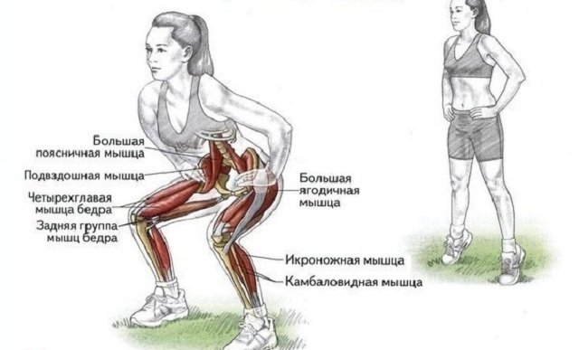 Правильное выполнение приседаний должно нагружать мышцы ягодиц и задней мышцы бёдер.