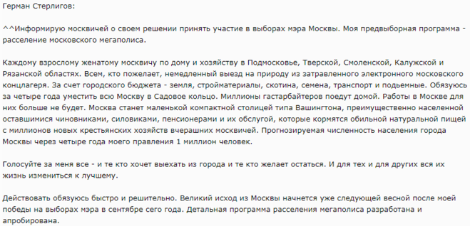 Я полагаю, Герман стерлигов — типичный пример люмпена в России. То что он вытворял в своей деятельности вызывает ужас среди профессионалов всех отраслей экономики, к которым он прикасался. Дорогие земляки-москвичи. Голосуйте за мэра "многоуважаемого" Германа Стерлигова, и через год вас останется целый миллион! Вот его предвыборная программа: