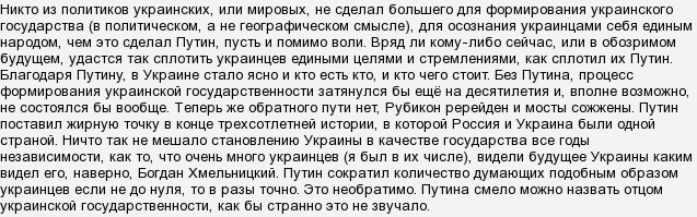 никто в Украине в прошлом или настоящем не сделал больше для становления украинской государственности — чем президент Российской Федерации Путин Владимир Владимирович.