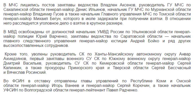 День добрый,Путин уволил: МЧС России по Томской области Михаил Бегун, ГУМЧС по Мурманской области Владимир Гусев , ГУМЧС по Сахалинской области Денис Ильинов, МЧС Владлен Аксенов, Начальник УМВД по Брянской области Валентин Кузьмин,главу департамента информационных технологий, связи и защиты информации МВД Сергея Ляшенко,руководителя УМВД по Ульяновской области Юрия Варченко,замначальника ГУМВД по Саратовской области Андрея Бойко,замглавы ГУМВД по Кемеровской области Игоря Коршунова и замруководителя ГУМВД по Нижегородской области Григория Ткаченко.