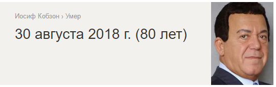 Тридцатого августа 2018 года он приказал всем нам долго жить. После тринадцатилетней борьбы с раком певец ушёл от нас в мир иной. Светлая память Иосифу Кобзону.