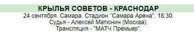Завершающий матч 8 тура 24 сентября 18:30(мск) На стадионе "Самара Арена" Крылья Советов принимают Краснодар.Трансляция на канале "Матч Премьер".Матч интересен тем,что Крылья Советов неделю отдыхали,а Краснодар 4 дня назад играл в еврокубках.
