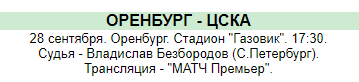 После кубковых матчей начинается 9 тур Премьер-Лиги и открывает его матч Оренбург — ЦСКА, встреча состоится 28 сентября на оренбуржском стадионе "Газовик". Дома Оренбург играет на максимуме, поэтому посмотреть будет очень интересно.