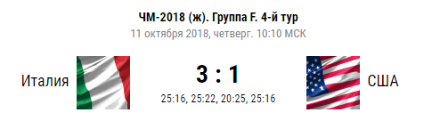 В этом матче победу довольно неожиданно одержали волейболистки сборной Италии, они победили сборную США со счетом 3:1, так что этим результатом они подарили шансы сборной России на выход в финал шести, для этого нашим нужно было обыграть сборную Китая, но к огромному сожалению, этого сделать не удалось, наши проиграли, а финал шести пройдет уже без участия нашей сборной, в целом, конечно Италия сотворила небольшую сенсацию, так как фаворитом матча были Американские волейболистки.