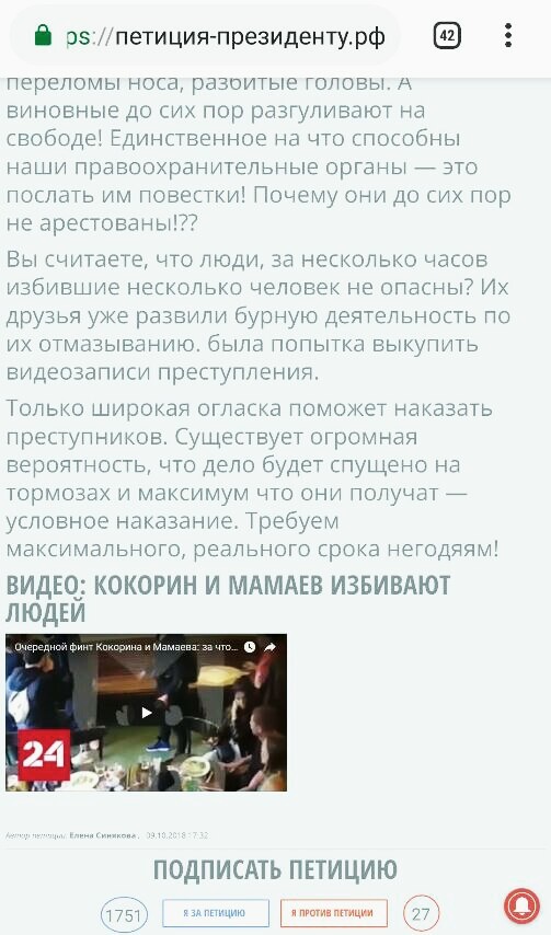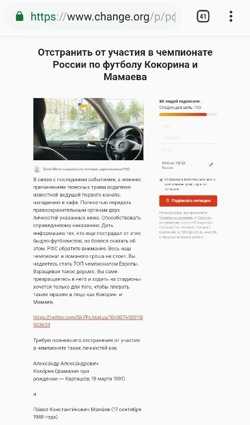 Уже имеется петиция против Мамаева и Кокорина, а желающие граждане могут ее подписать вот на этом сервисе. Она написана в адрес Президента, там описывается факт того, что спортсмены были в алкогольном угаре и избили несколько человек.