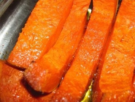 Тыкву нарезать долями ( как арбуз) без семечек и тщательно втереть смесь медовую с пряностями.