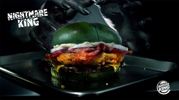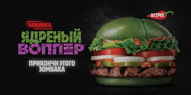 Очень жаль что никто так и дал ответа на данный вопрос. А ведь все очень просто, сначала бургер "Nightmare King" появился как водится в американской сети Burger King, а затем, не могу сказать с каким разрывом, но ближе к Хеллоуину, появился и в нашей сети Burger King в России, только перевели его как "Ядреный Воппер