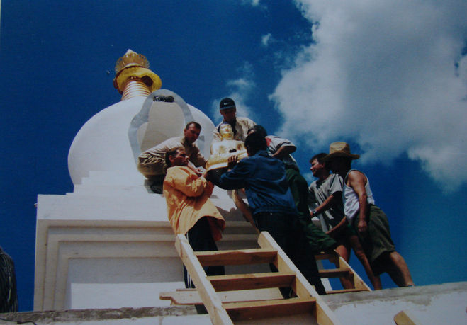 Это сооружение было построено буддистами школы Карма Кагью Тибетского буддизма. По тибетским канонам строительства ступ внутри заложены драгоценности и реликвии. ступа выражает качества просветленного ума каждый ее уровень и ступеньки чтото значат. Внутри находится барабан с миллионами мантр намотанных на бумаге в рулон. каждый поворот барабана который крутится означает как если бы вы прочитали такое количество мантр. Я принимала участие в росписи алтарной комнаты с барабаном. Там на стенах изображены все ламы передачи линии Карма Кагью — Кармапы и Шамарпы а так же будды. Вокруг ступы проложена круглая дорожка чтобы можно было совершать обхождения. Каждое обхождение ступы- накапливает духовную заслугу.