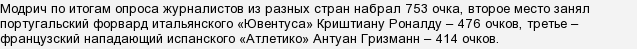 С вручение "Золотого мяча" Модричу закончился вечный междусобойчик дележа этого трофея между Месси и Роналду. Последний кстати стал вторым, а третьим стал также отлично проведший этот сезон француз Антуан Гризманн.