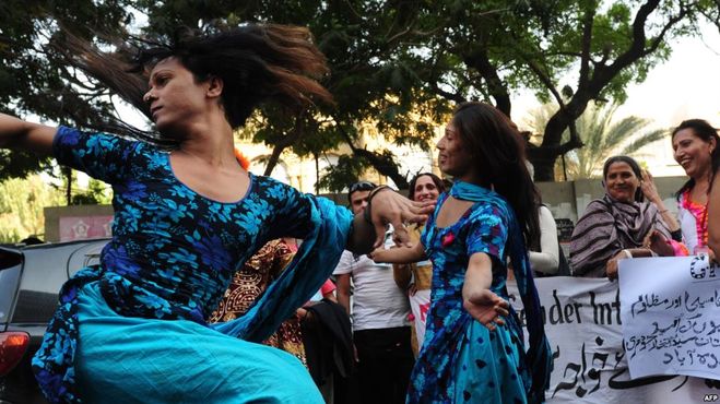 Индийские хиджра на празднике в честь юридического признания из в качестве пола (2014 г.). В других странах бывшей Ост-Индии их сестер признали ещё раньше; Непал 2008, Пакистан 2011, Бангладеш 2014.