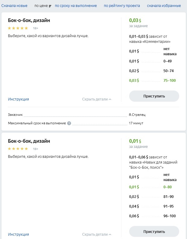 Например, у меня навык 75. В одном случае расценка 0,03$ 75–100, а в другом, для точно такого задания Бок-о-бок, дизайн 0,01$ 0–80.