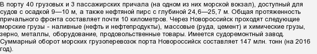 Новороссийск — крупнейший порт России. Порт Новороссийск обеспечивает внешнеторговые связи России со странами Азии, Африки, Средиземноморья и Южной Америки.