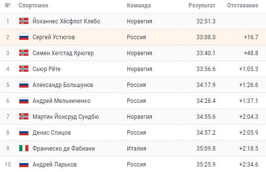 В мужской части все было более предсказуемо. Слишком большим был отрыв у Йоханеса Клебо даже для Сергея Устюгова.