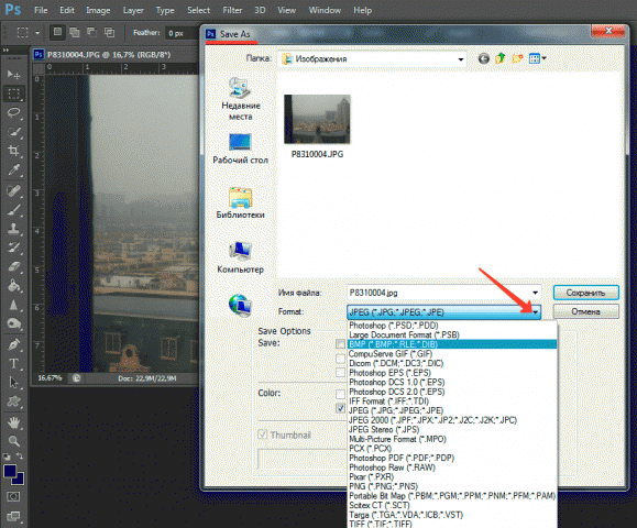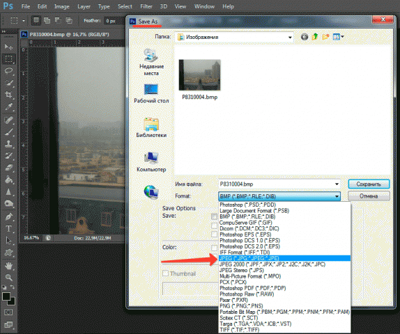 Затем, вам следует открыть программу Photoshop и файл, который Вы уже сохранили в новом формате BMP и повторить процедуру, возвратив в формат Jpg.