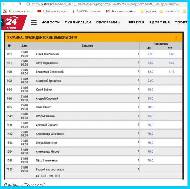Как я и сказал, по моему ощущению победит именно Порошенко — если бы я был азартным человеком и делал ставки, я бы поставил свои деньги именно на Порошенко. Скриншоты ставок в букмекерских конторах размещу ниже — на этих скринах есть и адресная строка сайта — можете узнать подробности на самом сайте.