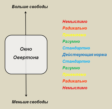 Суть теории Овертона в том, что есть окно свобод, которое регламентируется общественными институтами со стороны государства. В каждый исторический период некоторые идеи составляют действующую норму (ну, то есть, например, ты за общие европейские ценности то это -нормально) , и эта норма — точка отсчёта, а остальные идеи могут либо входить в диапазон допустимых, либо не входить.