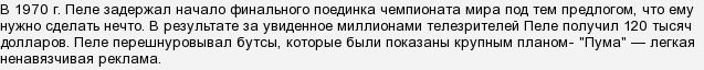Финальный матч чемпионата мира 1970 года знаменателен безобидной выходкой Пеле, принесшей ему немалые деньги. Он намеренно задержал начало финального матча и под прицелом множества камер стал шнуровать заново бутсы. Миллионы телезрителей увидели фирменный знак "Пумы". Лучшего момента для рекламы в футболе трудно придумать.