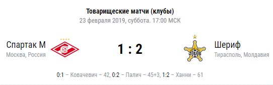 В субботу 23 февраля московский Спартак провёл последний контрольный матч на сборе в Турции. Соперником на этот раз был молдавский Шериф. И снова красно-белые не победили и даже не сыграли в ничью. Матч закончился поражением Спартака со счётом 2:1. В концовке первого тайма игроки Спартака расслабились и пропустили два мяча, один на 42, другой уже на 3 добавленной минуте. А вот второй тайм был сыгран очень прилично, спартаковцы создали кучу моментов и вообще не дали ничего сделать молдованам. Жаль, что реализовать смогли лишь один момент, гол на 61 минуте забил Софьян Ханни. Два сбора у Спартака без побед, но вряд ли болельщикам стоит это принимать близко к сердцу. К игре с Краснодаром всё должно быть по-другому.