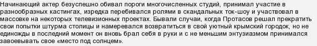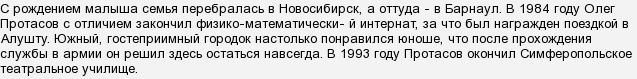 Так вот, на сегодняшний день (27.02.2019) О.Н.Протасову полных 51 лет. Он появился на белый свет четвёртого декабря 1967 года в посёлке Панкрушиха, что на Алтае. При рождении родители нарекли мальчика Олегом. Через какое-то время он вместе с мамой и папой переехал в город Новосибирск, когда Олежке исполнилось семь лет вся семья перебралась в город Барнаул. В этом городе Олежка пошёл в первый класс физико-математического интерната и успешно закончил восемь классов. За отличное окончание учёбы подросток Олег был награждён путёвкой в курортный город Алушту. Олегу очень понравился крымский город и он решил после службы в армии переехать в Крым жить. И действительно, отслужив в армии положенный срок он переехал жить в город Симферополь. В этом городе он поступил и с успехом закончил театральное училище. В 1995 году за банальную кражу попал на зону и через три года был освобождён.