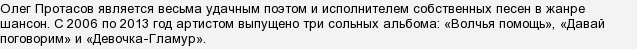 Когда я прочитал вопрос, то сразу же вспомнил нападающего украинского футбольного клуба "Днепропетровск" и сборной СССР Олега Протасова, который блистал на футбольных полях в 80-х годах XX века. Но посмотрев на теги, понял, что Вы имеете в виду другого Олега Протасова. А именно, актёра, поэта и певца в жанре шансон.